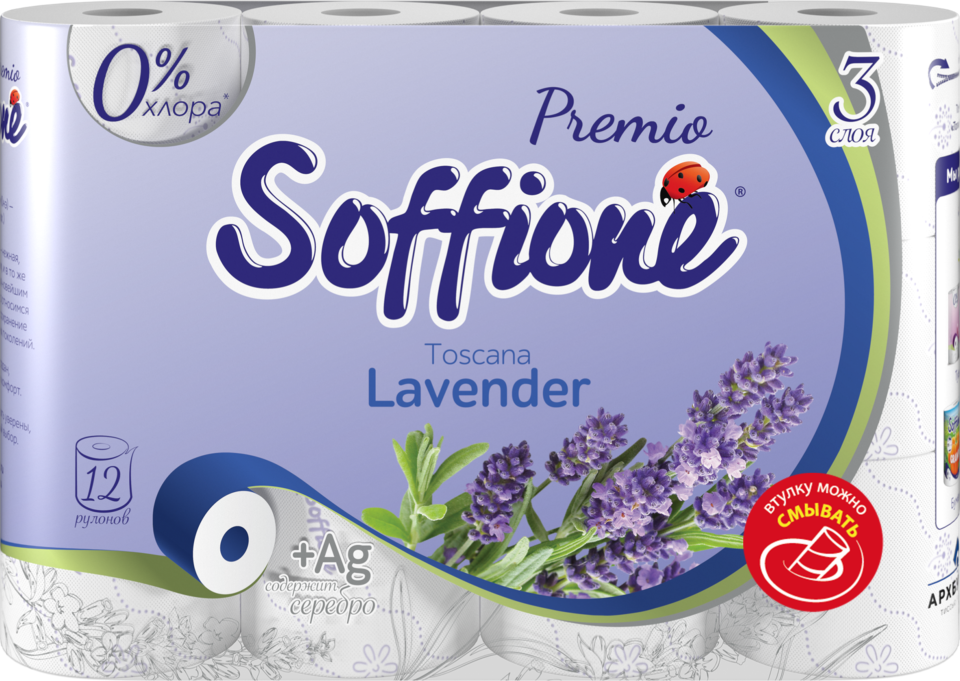 ТБ SOFFIONE PRMIO 16,8 м 3 слоя 12 рулонов ЛАВАНДА смываемая втулка /5/ 10901002