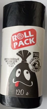 Главная / Мешки для мусора, пакеты для продуктов / Мешки для мусора / РОЛЛ ПАК Мешки для мусора ПВД 120л. 10шт черные 40мкр 410 г /30/ УФАПАК МВ8846