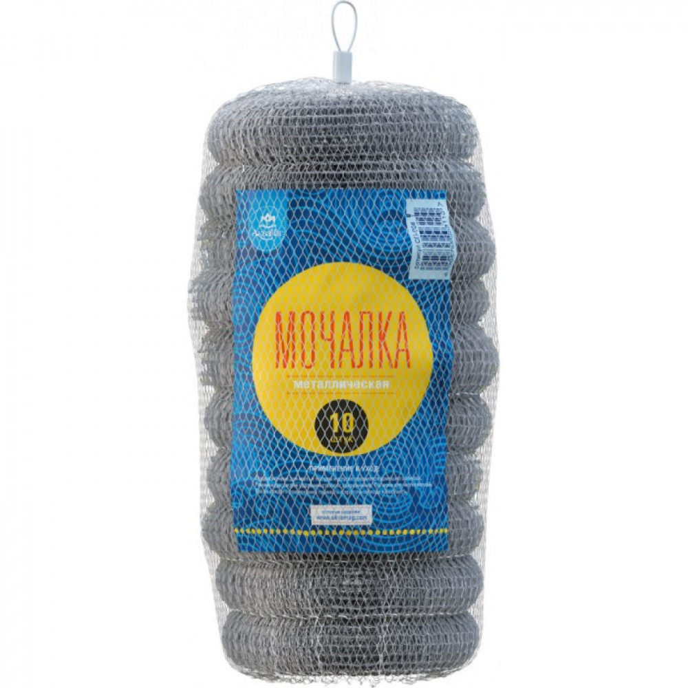 Главная / Губки хозяйственные и салфетка для уборки / Губки для посуды / Губка металлическая 10 шт. в СЕТКЕ 14г. /100/ СП-008 АкваМаг