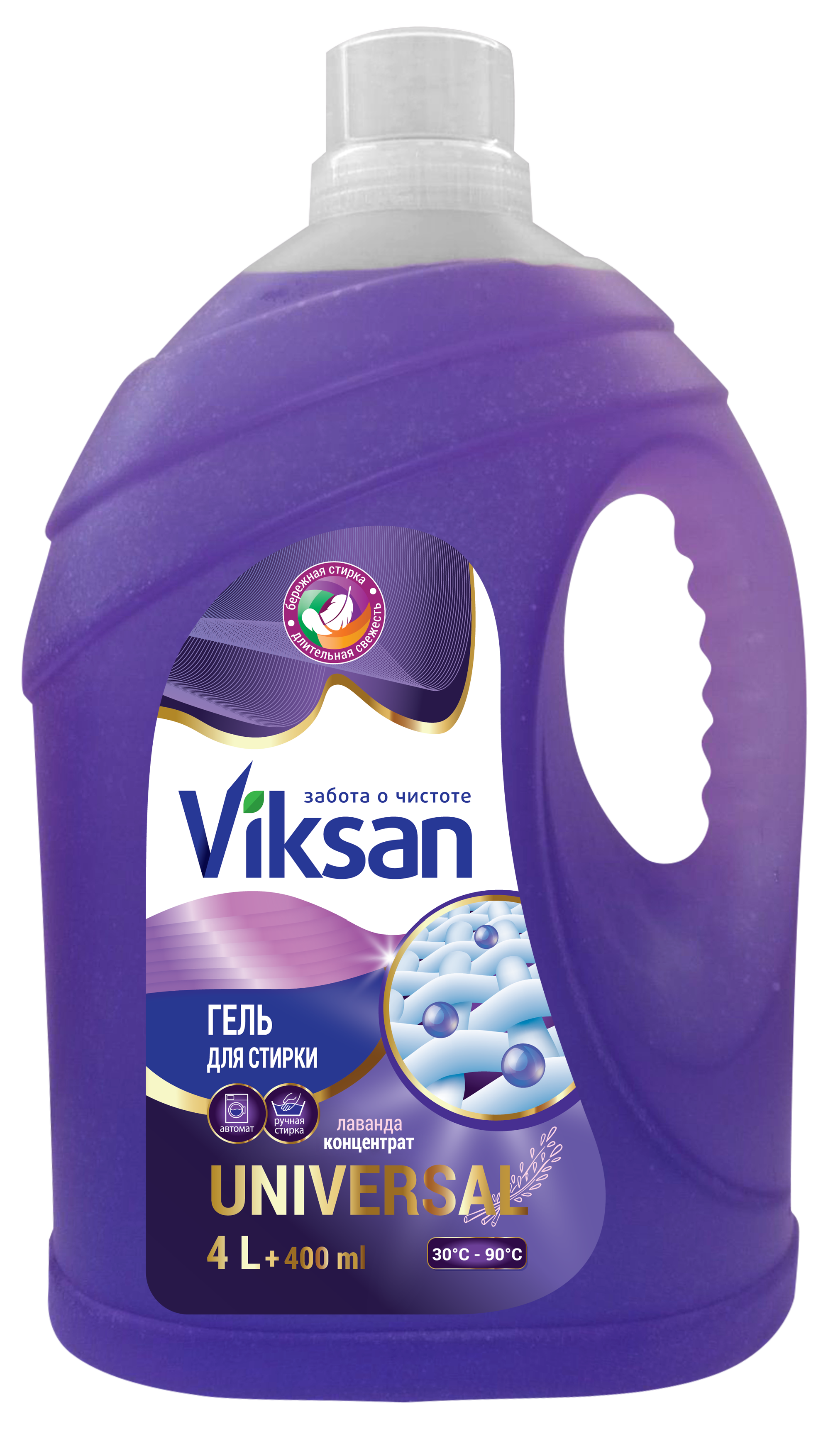 Средство моющее синтетическое гелеобразное универсальное VIKSAN концентрат экспресс-стирка "Лаванда" предназначено для стирки всех видов тканей в стиральных машинах любого типа и для ручной стирки.